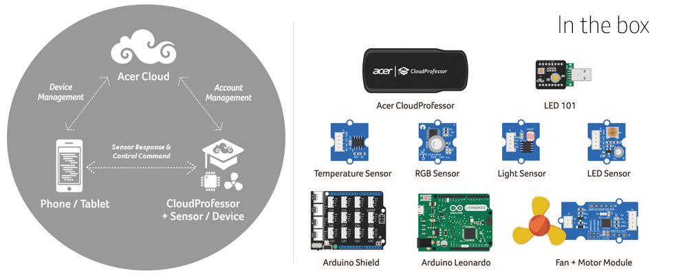 Acer CloudProfessor is the world’s first IoT starter kit; combining hardware, software, and the Cloud. It’s the easiest way to introduce your students to the Cloud and enable them to bring what they create to the world.